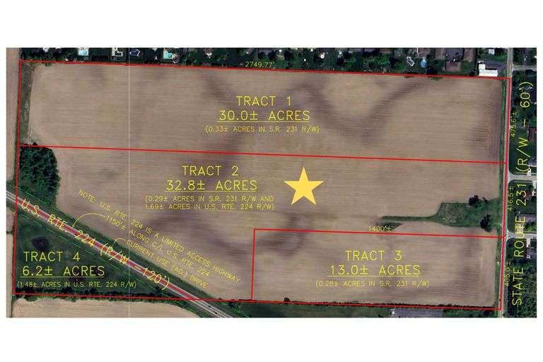 Tract #2: 32.8+/- acre versatile tract features mostly tillable farmland with a small section of woods adding diversity and potential. With extensive road frontage along both US-224 and State Route 231, this property offers excellent accessibility and visibility for farming, recreation, or potential future use.