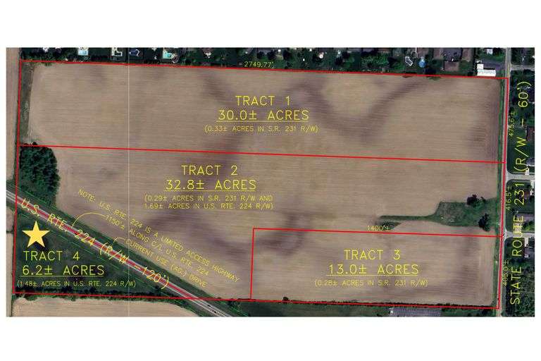 Tract #4: 6.2+/- acres of grassland. Approximately 1150’ of frontage and access off US-224. Tract is currently enrolled in CRP.