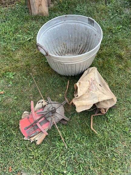 LOT 410 - 2 grass seeders and bushel aluminum tub