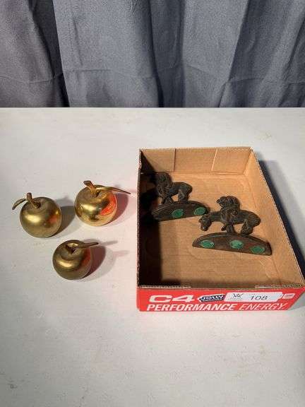 LOT 108 - Brass Apple Bell & Pr Castiron Book Ends